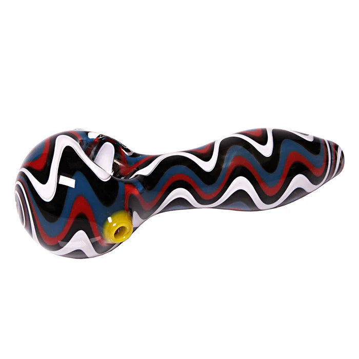 Multi-coloured 4" glass pipes. A black and white patterned colour with a zig-zag/swirl design, left-sided choke, and deep dry-herb bowl.